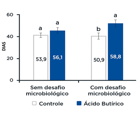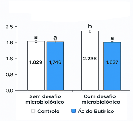 No estudo, a avaliação do ganho de peso e conversão alimentar de frangos evidencia que o uso de ácido butírico é eficiente, principalmente frente a um desafio microbiológico.